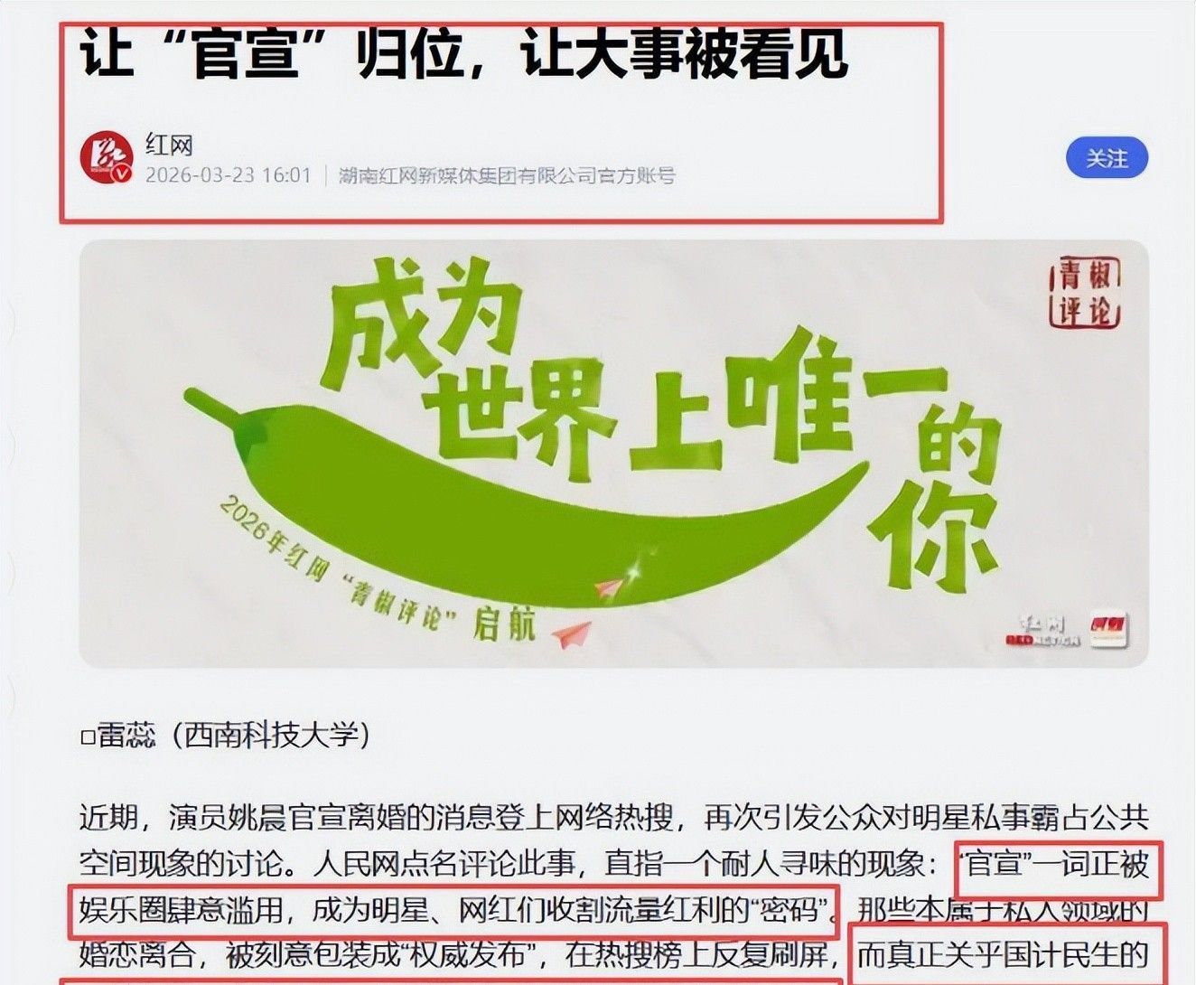 官媒所批驳的,从来不是婚配干系的当然赶走,而是像姚晨这般滥用全球语汇、挤占全球平台、豪侈全球资源的失范行为。唯一趟归本位,“官宣”智力重拾其尊容底色,让着实攸关民生国计的大事获取应有的传播权重与社会回响。