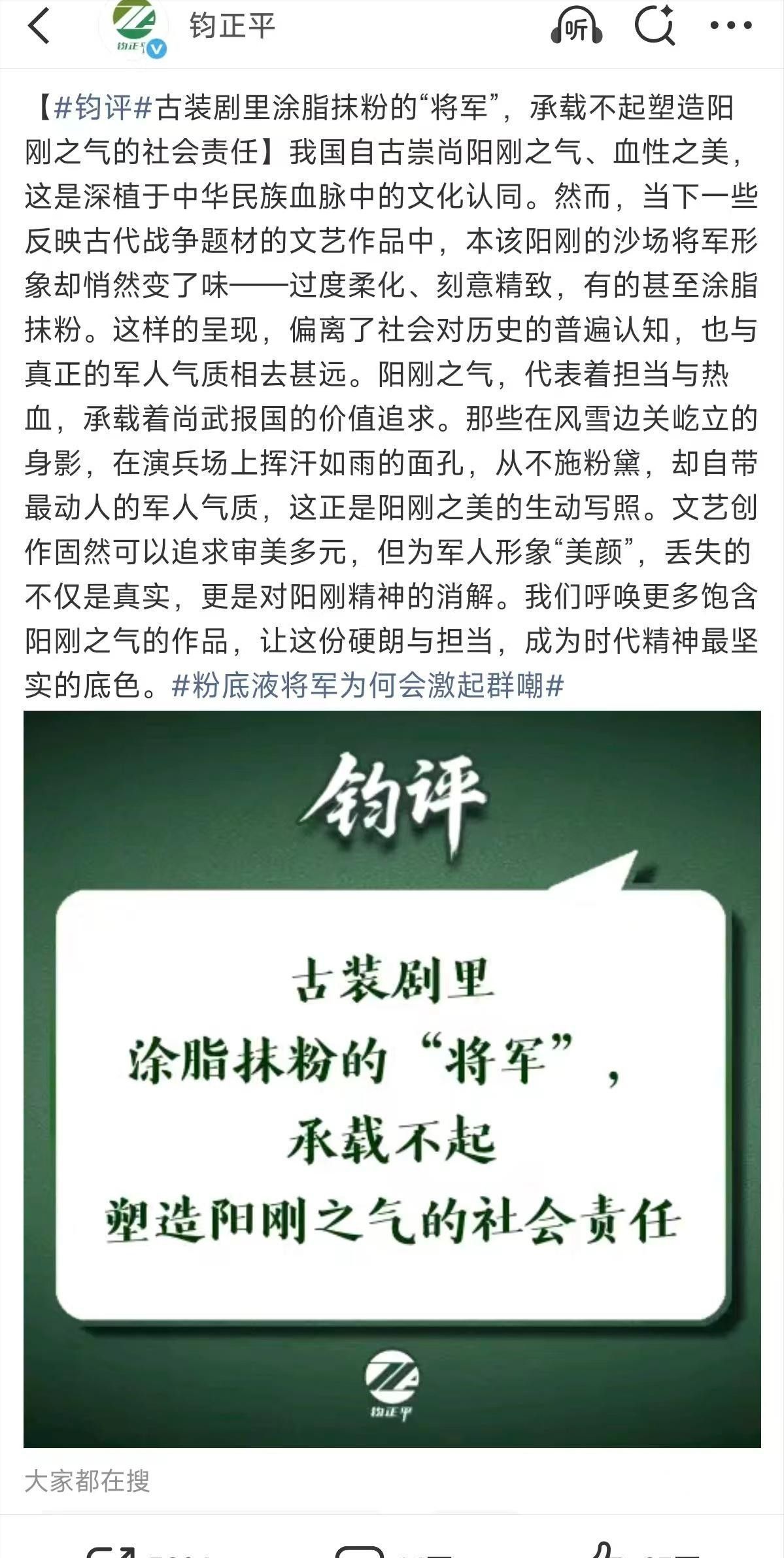 3月27日,钧正平服务室精良发文纠偏,直指当下古装剧中过度修饰、刻意柔化的将军形象,已背离塑造阳刚气质的社会期待;强调这种审好意思取向实质上是对军东说念主精神内核与雄健气派的悄然解构。