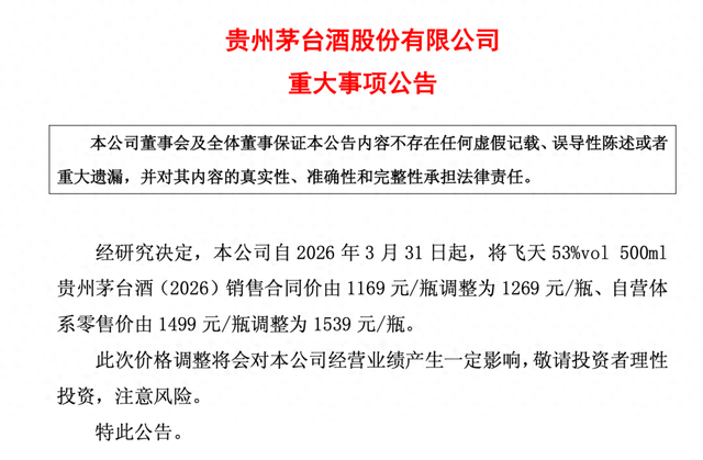 3月30日晚,贵州茅台发布公告,告示自2026年3月31日起,将飞天53%vol 500ml贵州茅台酒(2026)销售契约价由1169元/瓶调养为1269元/瓶,自营体系零卖价由1499元/瓶调养为1539元/瓶。