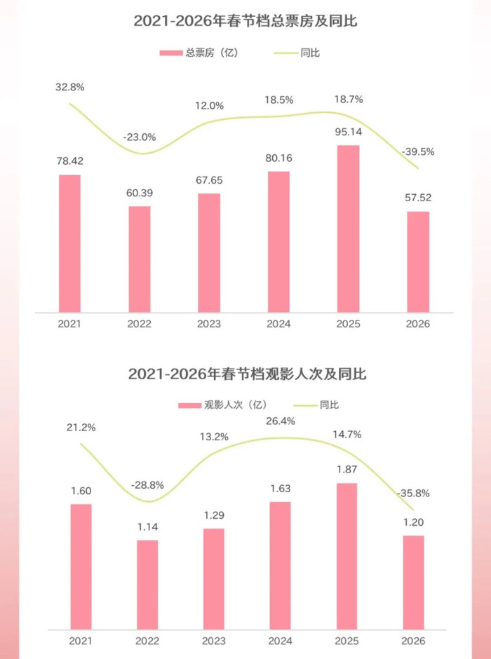 据猫眼发布的春节档数据瞻念察,2026年春节档(正月月吉至初九,共9天)以57.52亿元收官,同比下滑39.5%,与2018年合手平;总不雅影东说念主次为1.2亿,同比下降35.8%。最热切的是,平均票价更是降到了47.8元,同比下降5.9%,是近六年来票价最低的一年。
