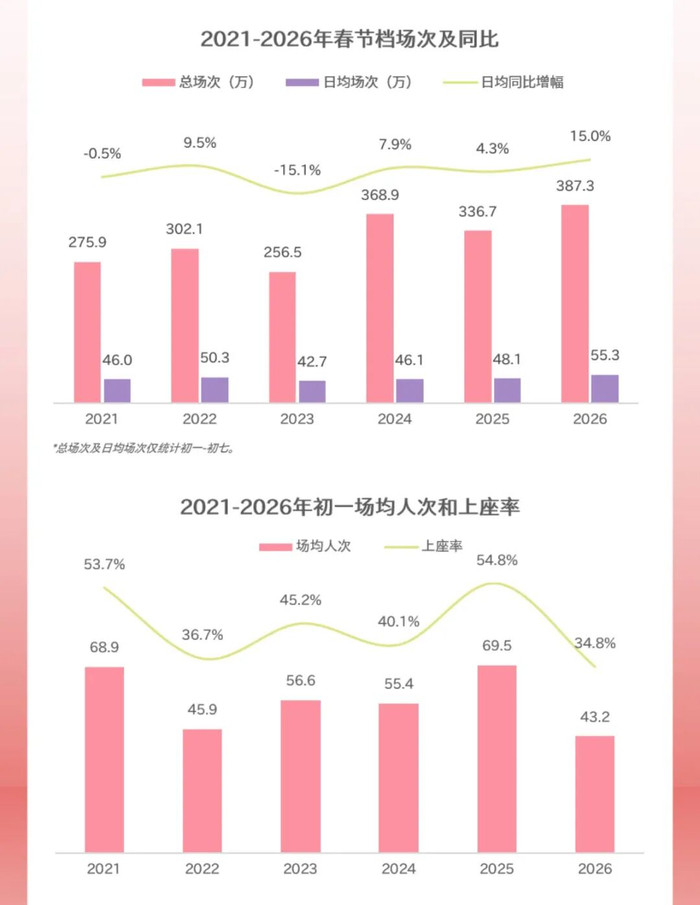 深嗜的是,在票房、不雅影东说念主次以及票价齐走低的情况下,本年春节档独一不错吹嘘的小数是“场次”——总场次达到387.3万,日均场次冲破55万,增幅超10%,主要原因是档期内影瞬息长比之前大幅裁汰。不外场均上座率仅为43%,亦然近六年新低。网友辣评:“白白虚耗电”。