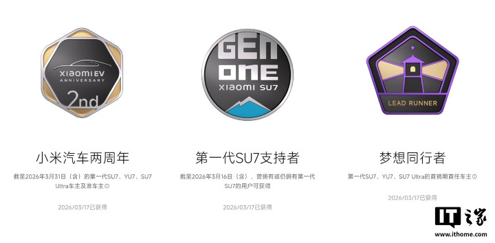 IT之家3月18日音书,小米SU7初代车型将于本月底迎来发布两周年,当今小米汽车App已偷偷为老车主推出专属牵挂,向顺应条目的用户披发三枚诬捏勋章,小米汽车现车主与历史车主均可按条目赢得,开元棋牌官网不斥地账号绑定与车辆过户收尾。