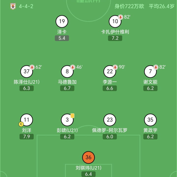 在泰山队其他首发球员中,卡扎伊什维利得到了7.2分,马德鲁加6.7分,李源一6.6分,刘骐玮6.4分,陈泽仕6.3分,彭啸、黄政宇、谢文能均得到6.2分,阿尔瓦罗唯有6.0分。