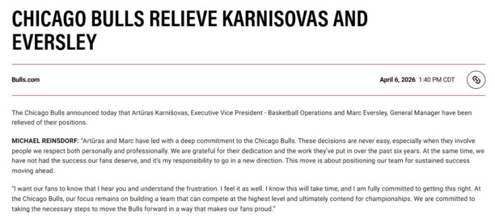 北京时间4月7日,芝加哥公牛队官方文告,球队已解任篮球运营推行副总裁阿尔图拉斯-卡尔尼绍瓦斯,以及总司理马克-埃弗斯利。