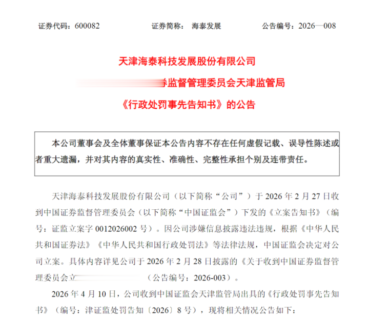 回溯来看,海泰发展于2026年2月27日收到证监会下发的《立案文书书》。因公司涉嫌信息败露违法违纪,证监会决定对公司立案。