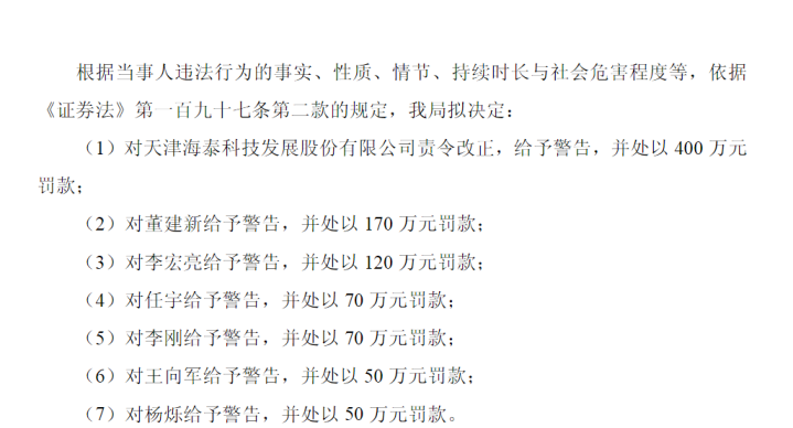 中国证监会天津监管局拟决定,对天津海泰科技发展股份有限公司责令改正,赐与申饬,开元棋牌app并处以400万元罚金;对海泰发展时任董事长董建新等6名拖累东说念主赐与申饬,并臆度罚金530万元。
