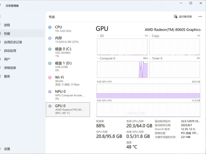 在上手折腾软件之前,我们得先聊聊这台机器的底气。这颗AMD锐龙AI Max+ 395接收chiplet小芯片联想,在塞进16个全血Zen 5 CPU 中枢的同期,还集成了畛域接近中高端独显级别的GPU单位。对心爱玩AI的用户来说,最让东说念主圆润的不仅是中枢数,而是128GB LPDDR5x-8000 的长入内存。