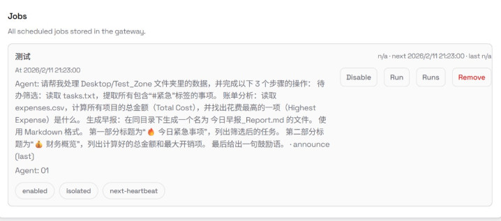 OpenClaw生成了剧本,写入土产货目次,并协助建树盘算推算任务。任务被顺利写入调节系统,粗略在指定时期自动履行。在这个过程中,模子不再仅仅器具,而更像一个自动化配合者。它交融雇务筹划,生成履行逻辑,并参与系统层面的建树。