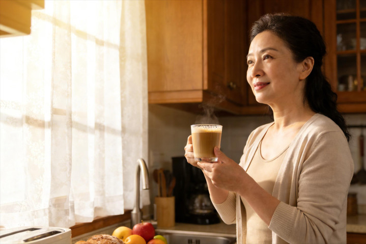 阳光透过黎明的窗帘洒进厨房,李大姨正端起一杯香气四溢的咖啡。